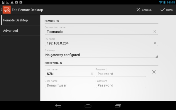 Agora que você já tem em mãos tanto o endereço IP local quanto o externo do seu computador, chegou a hora de executar o app Microsoft Remote Desktop no seu gadget. No nosso exemplo, usamos um aparelho com Android.